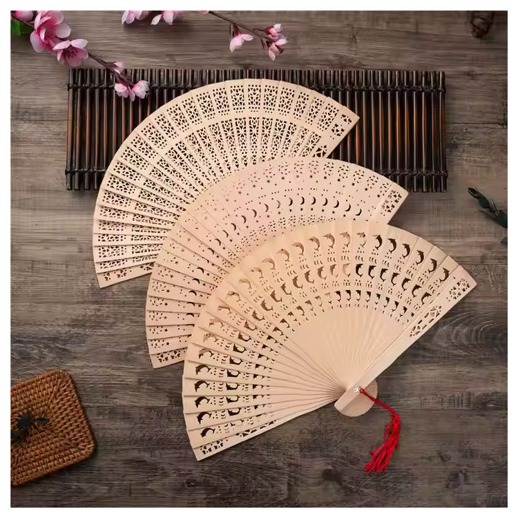 Ekspert lavet af naturlig bambus, hver ventilator fremviser indviklede udskårne mønstre og glatte finish, der fremkalder traditionel elegance. En perfekt blanding af funktionalitet og æstetik, ideel til fester med vintagetemaer, udendørs bryllupper eller kulturelle begivenheder.