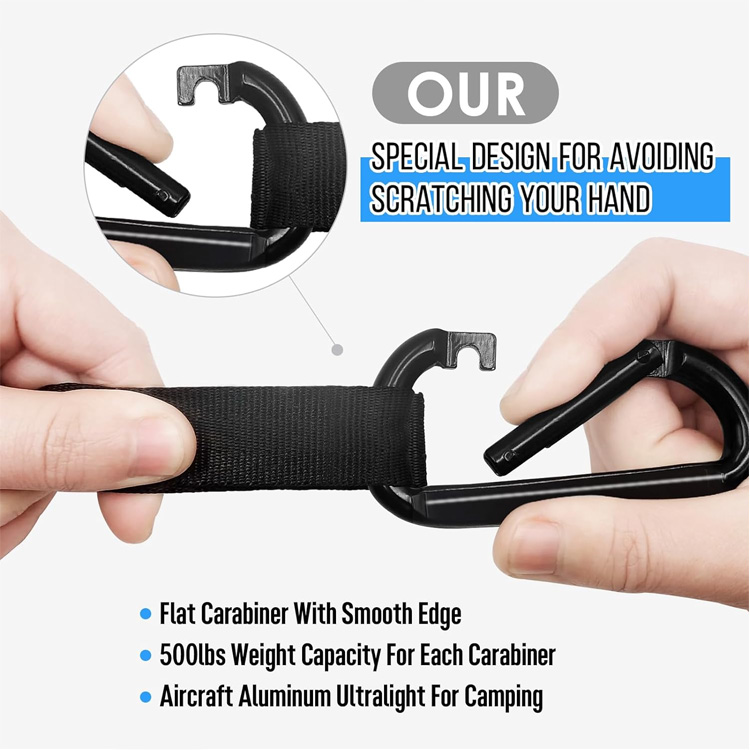 Inkluderer to 10-fods justerbare træstropper med 15+ løkkepunkter og militærkvalitets aluminiumskarabinhager, hvilket muliggør sikker installation på træer med en afstand på 12 til 25 fod uden at beskadige barken.