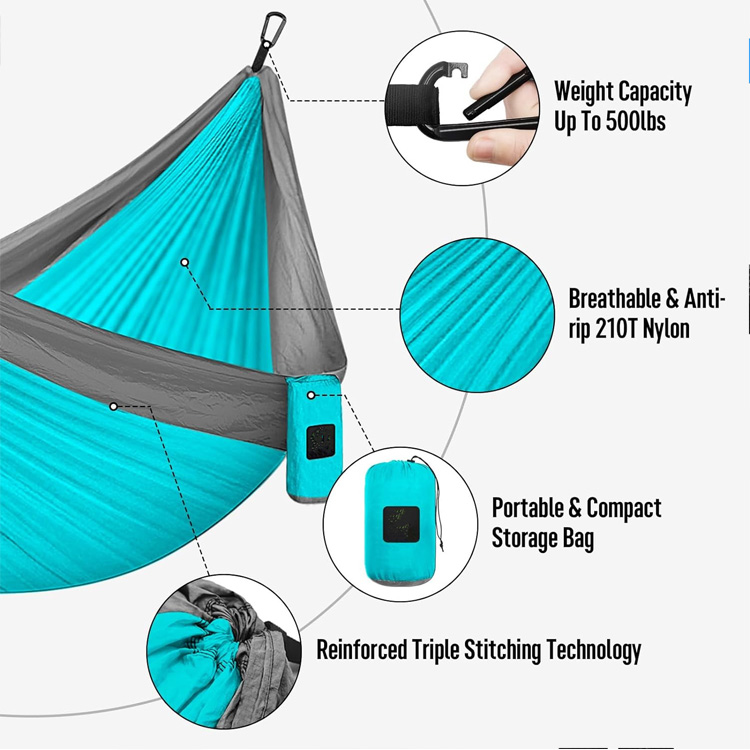Denne hængekøje er lavet af autentisk 70D ripstop-nylon med diamantvævet mønster og leverer den perfekte balance mellem styrke, åndbarhed og hurtigtørrende ydeevne til forskellige vejrforhold.