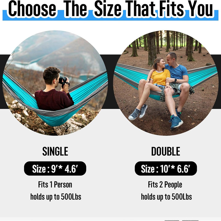 Camping hængekøje Dobbelt og enkelt bærbar hængekøje. Dit ultimative alsidige afslapningssystem til udendørs eventyr. Denne campinghængekøje kan rumme både dobbelt- og enkeltbrugere med sit adaptive design. Komplet med professionelle træstropper leverer denne lette faldskærmshængekøje i nylon maksimal komfort og bærbarhed.