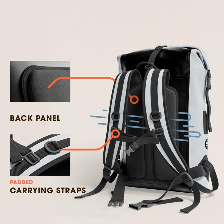 Inkluderer komfortabel polstret skulderrem, flere bærehåndtag og eksterne kompressionsstropper til sikker fastgørelse til rygsække eller vandfartøjer under aktiv bevægelse.