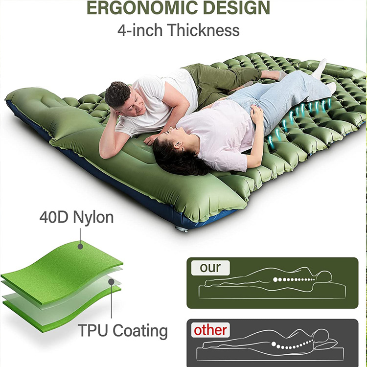 Dobbelt-person camping liggeunderlag Oppustelig campingunderlag. Ultimativ dobbelt komfort til udendørs eventyr. Denne oppustelige campingpude til to personer tilbyder rummelig soveplads med et innovativt fodfastholdende design, der forhindrer glidning. Som en ultralet løsning leverer den uovertruffen bærbarhed og fælles komfort for campingpar og venner.