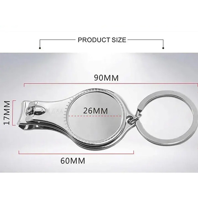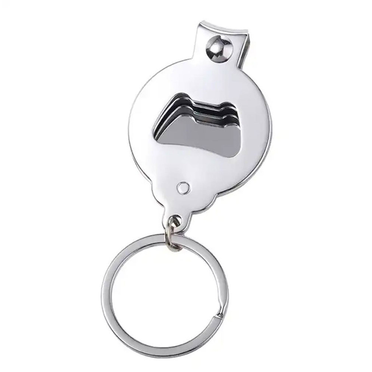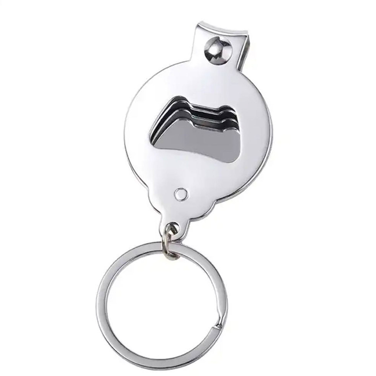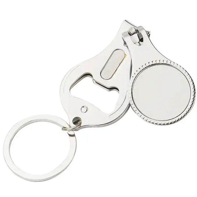 Foldbar håndtååbner Nøglering Neglesakse Negleskærere. Holdbar multifunktions foldbar nøglering med neglesaks, flaskeåbner og nøgleholder, perfekt til rejser og hverdagsbrug. Sublimeringsblank overflade tillader brugerdefinerede logoer eller design, hvilket gør det til en ideel salgsfremmende gave eller personligt tilbehør.