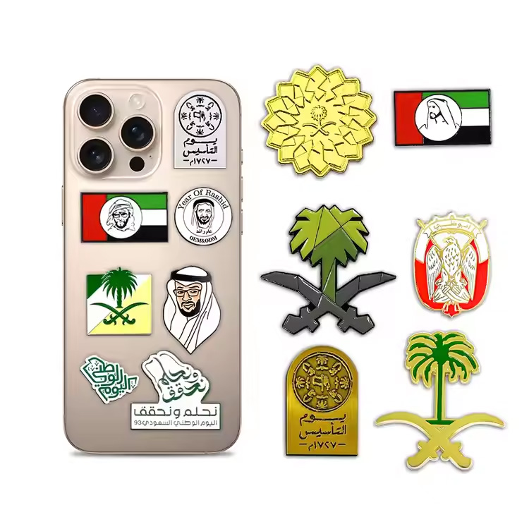 Funktioner ikoniske nationale symboler, flag, emblemer og portrætter inspireret af Saudi -Arabien, UAE og andre kulturelle elementer. Ideel til fejring af national dag, kulturelle begivenheder eller udtrykke patriotisk stolthed.