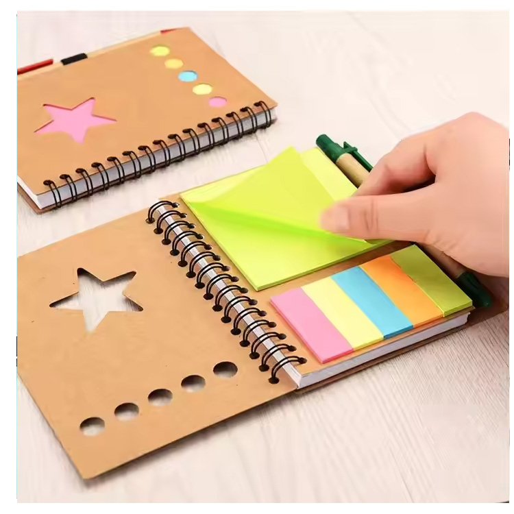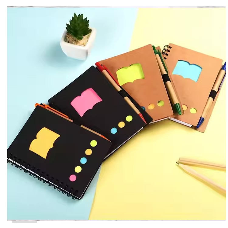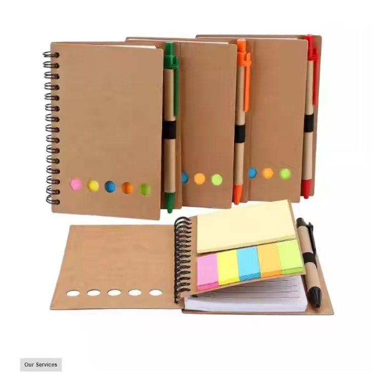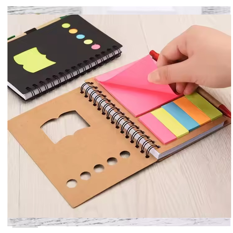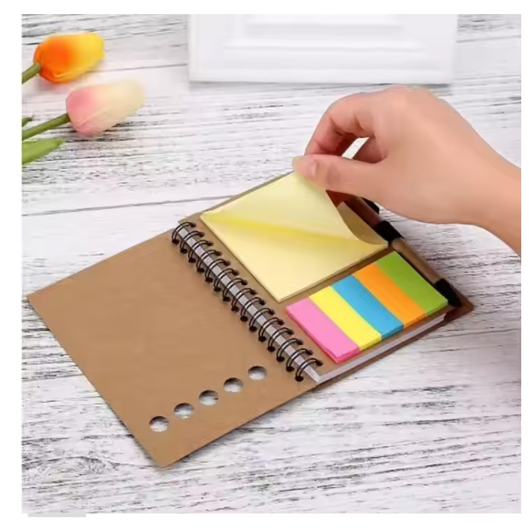 Salgsfremmende tilpasset design spiral notebook med pen.eco-venlig Kraft spiral notebook med pen og klistrede noter, perfekt til kontor, skole eller salgsfremmende brug. Inkluderer farverige indeksfaner, foret sider og en pappen. Kompakt, praktisk og ideel til branding eller virksomhedsgalt.
