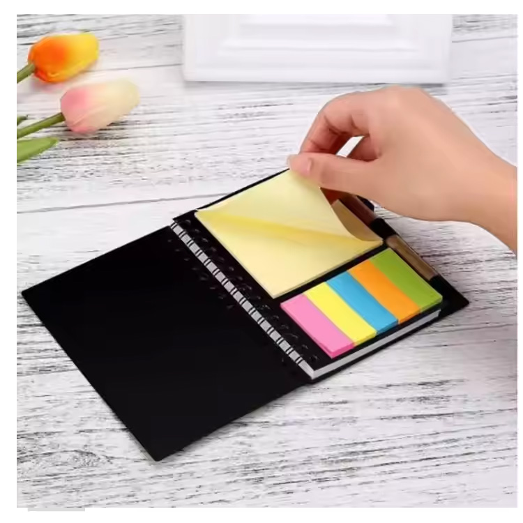 Den robuste spiralbinding sikrer let side-drejning, mens de inkluderede sticky toner giver fleksibilitet til mærkning eller påmindelser. Penholderen holder pennen på plads, hvilket gør den ideel til rejser, møder eller daglig brug.