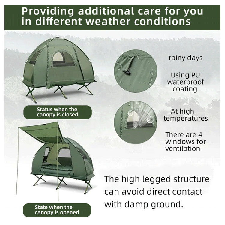 Har en indbygget, forhøjet soveplatform, der kombinerer fugtsikker beskyttelse med forbedret komfort, der effektivt adskiller dig fra fugtig jord og forbedrer isoleringen.