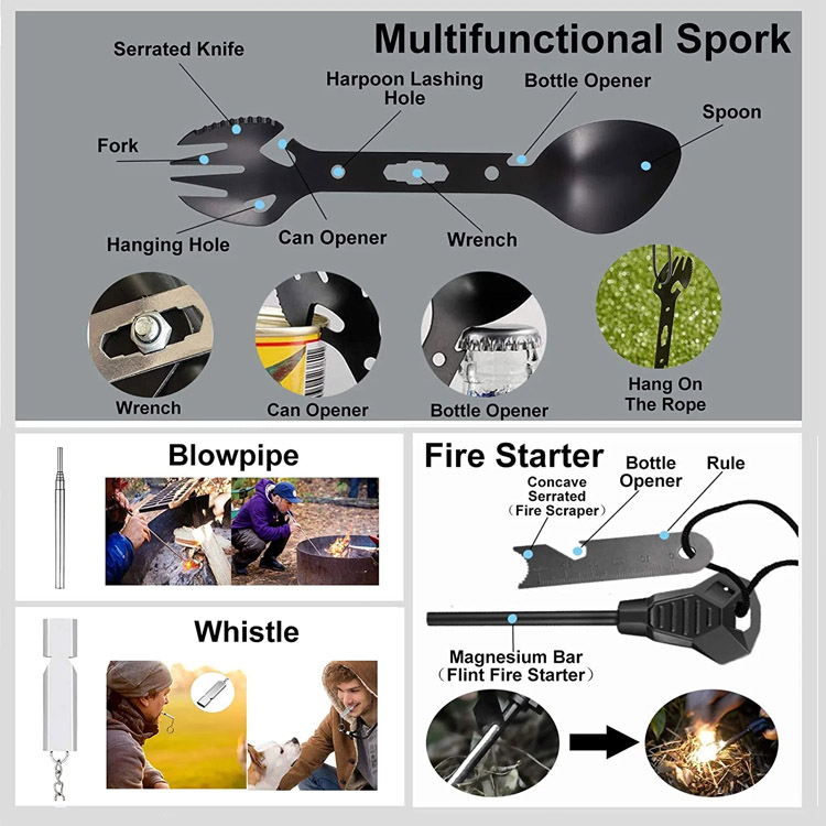 Dette alt-i-én-sæt er omhyggeligt sammensat til alsidige scenarier og indeholder vigtige værktøjer til vildmarkscamping, udvidede vandreture, fiskeudflugter og storvildtsjagtekspeditioner.